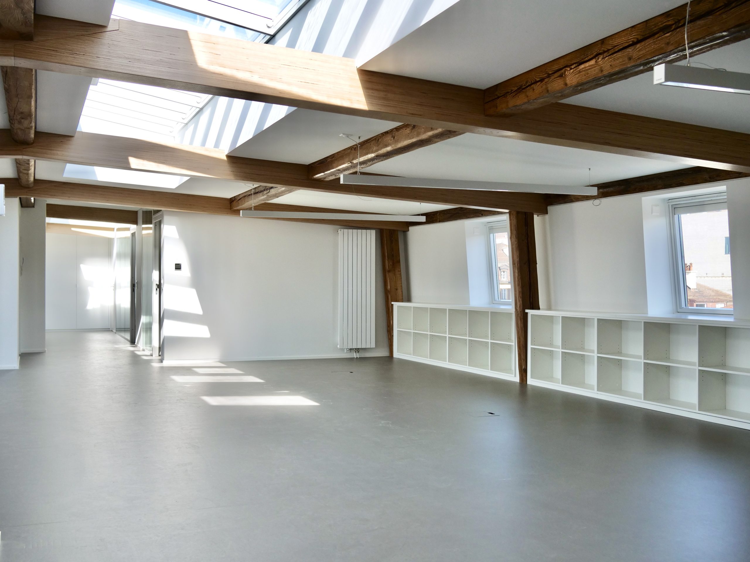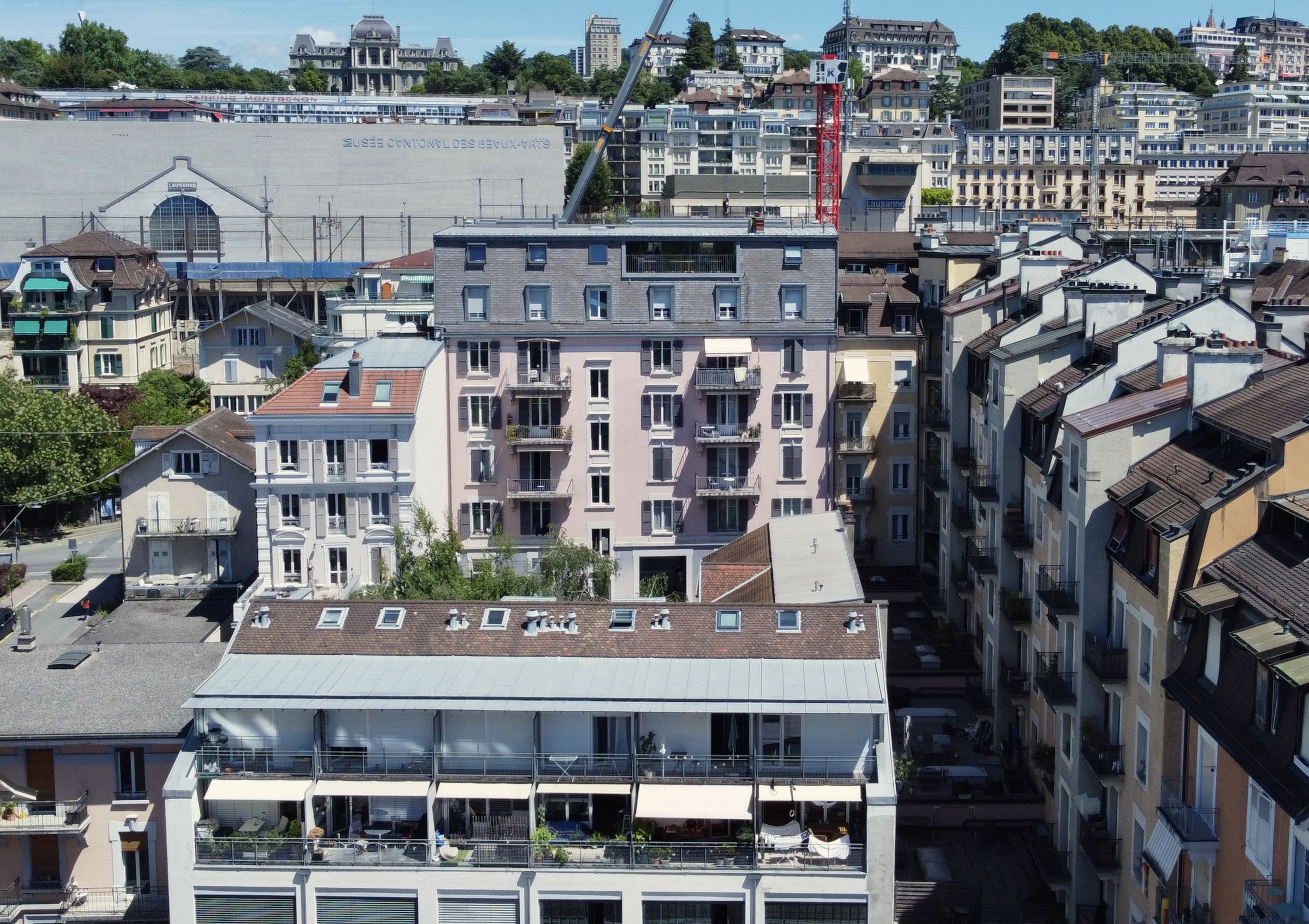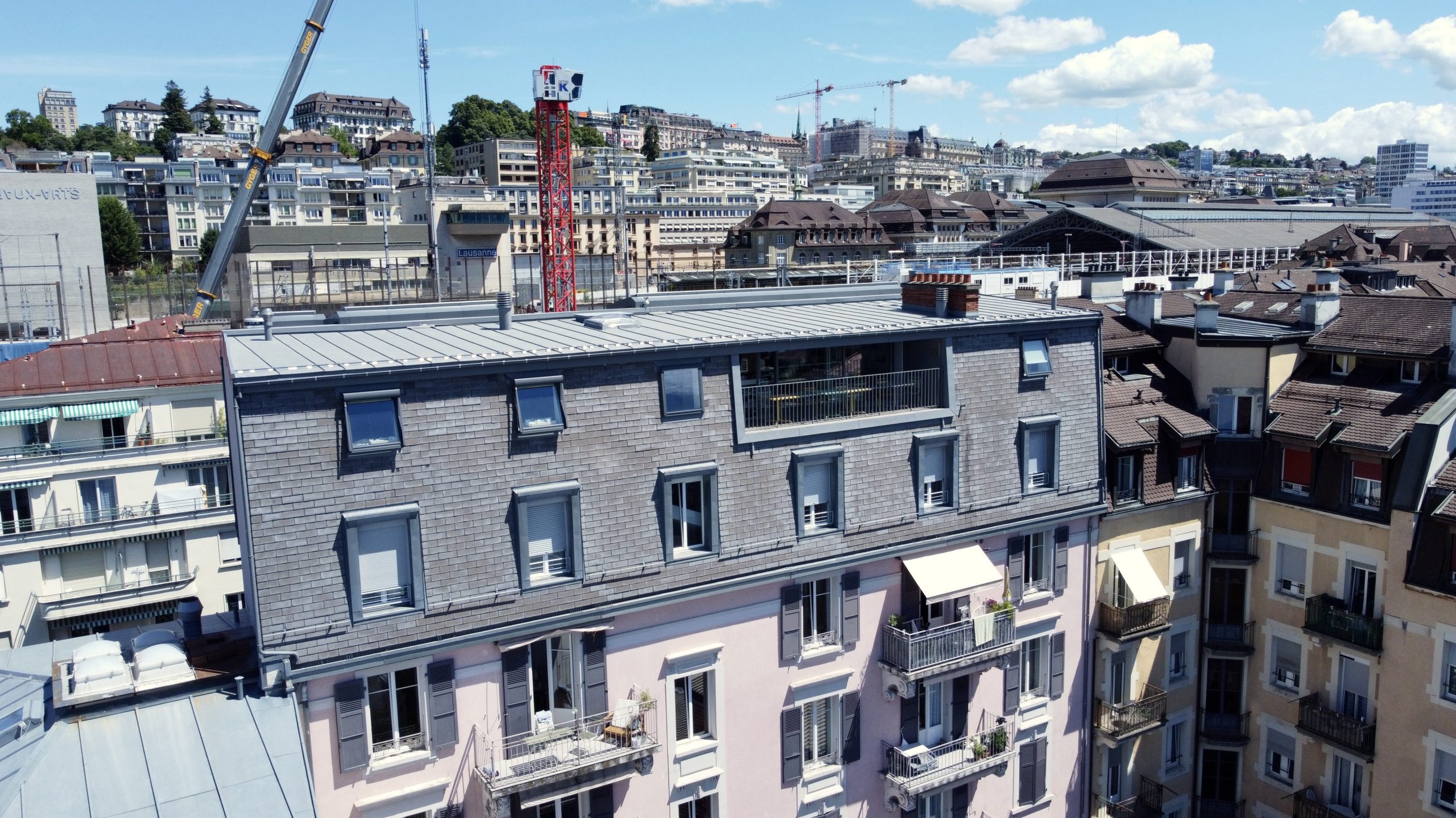 Réaménagement des combles et rénovation de la toiture de l’immeuble Avenue de Grancy. L’espace est traversant nord-sud, avec des vues orientées vers le centre ville de Lausanne ainsi que vers le lac et les reliefs alpins. Aujourd’hui la surface accueille des bureaux dont le centre est un open space.