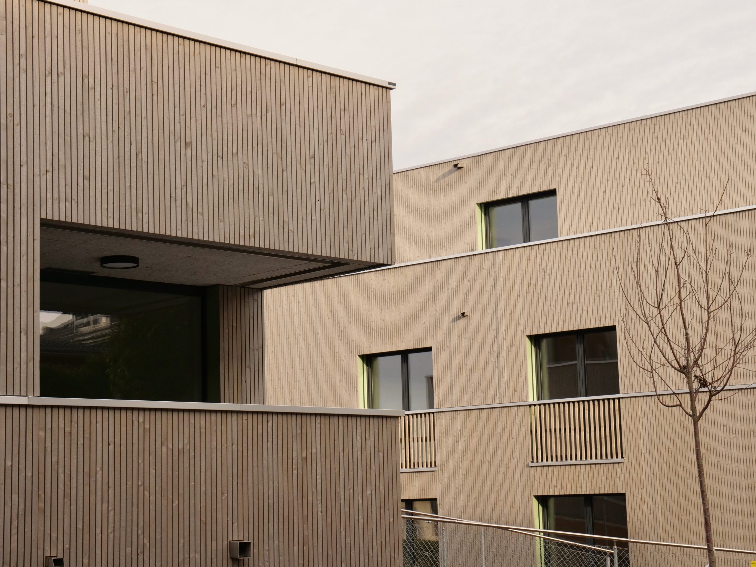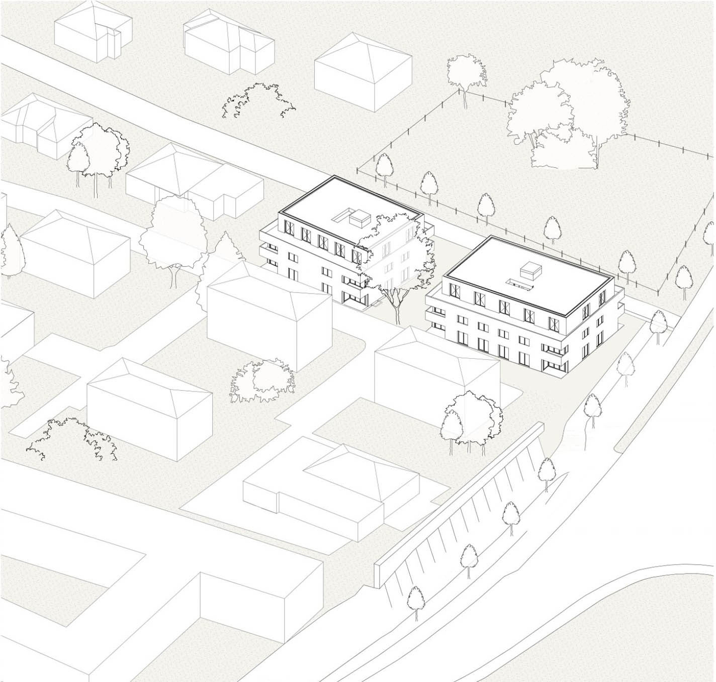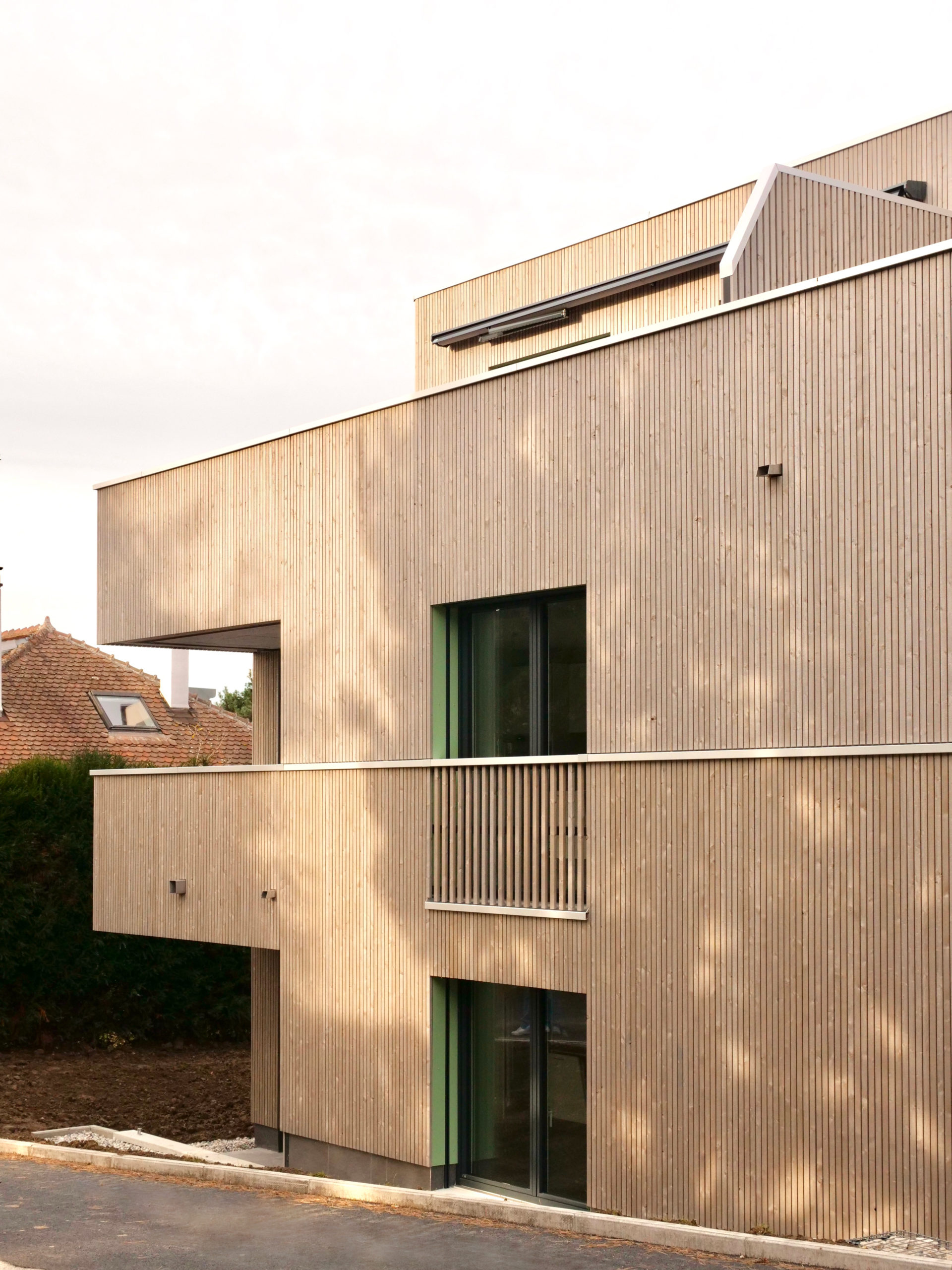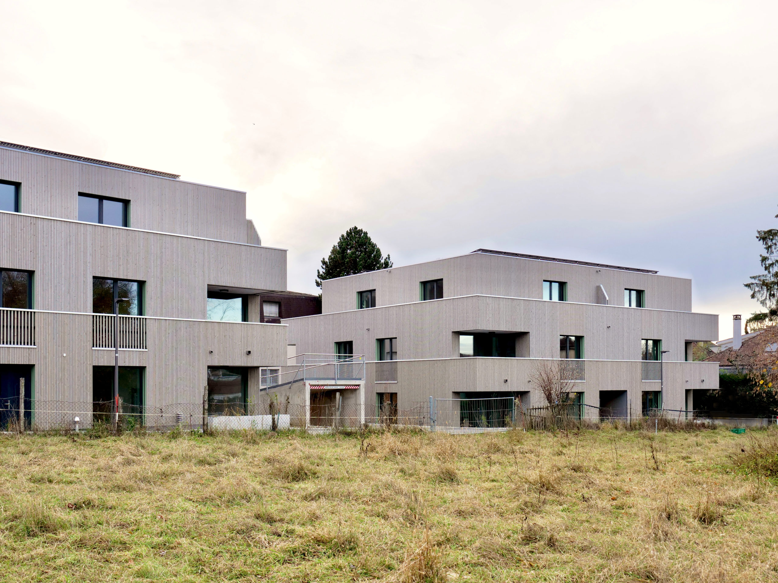 La parcelle se situe dans la partie sud de la commune de Crissier, en bordure d’un quartier de logements de densité moyenne, marquant une limite entre la zone industrielle et commerciale et les quartiers d’habitation de la commune. Le programme s’articule en deux volumes distincts, de taille différente. Cette distribution permet de respecter l’échelle domestique des alentours et de mettre en valeur le grand bouleau existant. La légère rotation de chacun des deux volumes par rapport à la limite de la parcelle amène une dynamique urbaine.