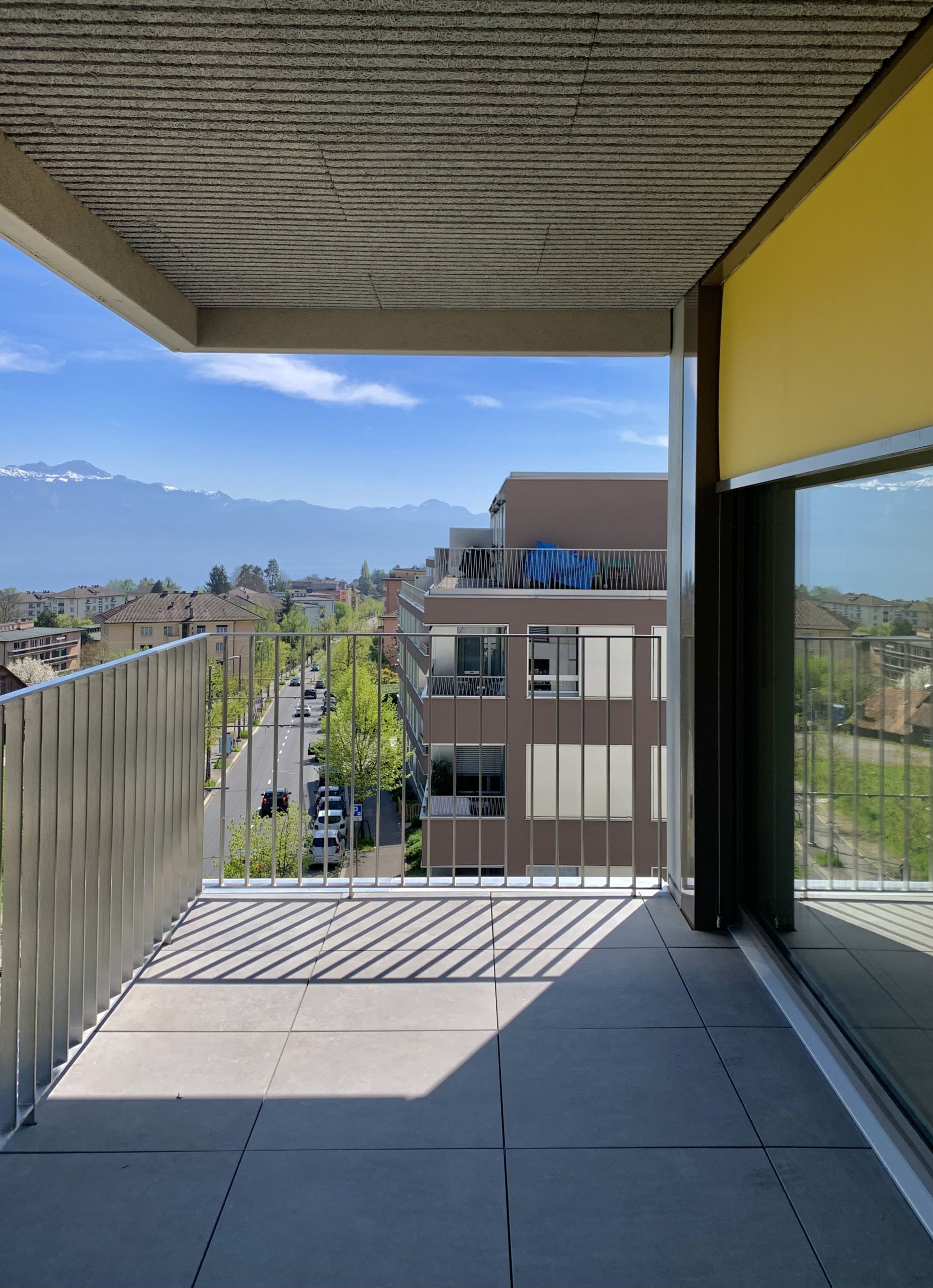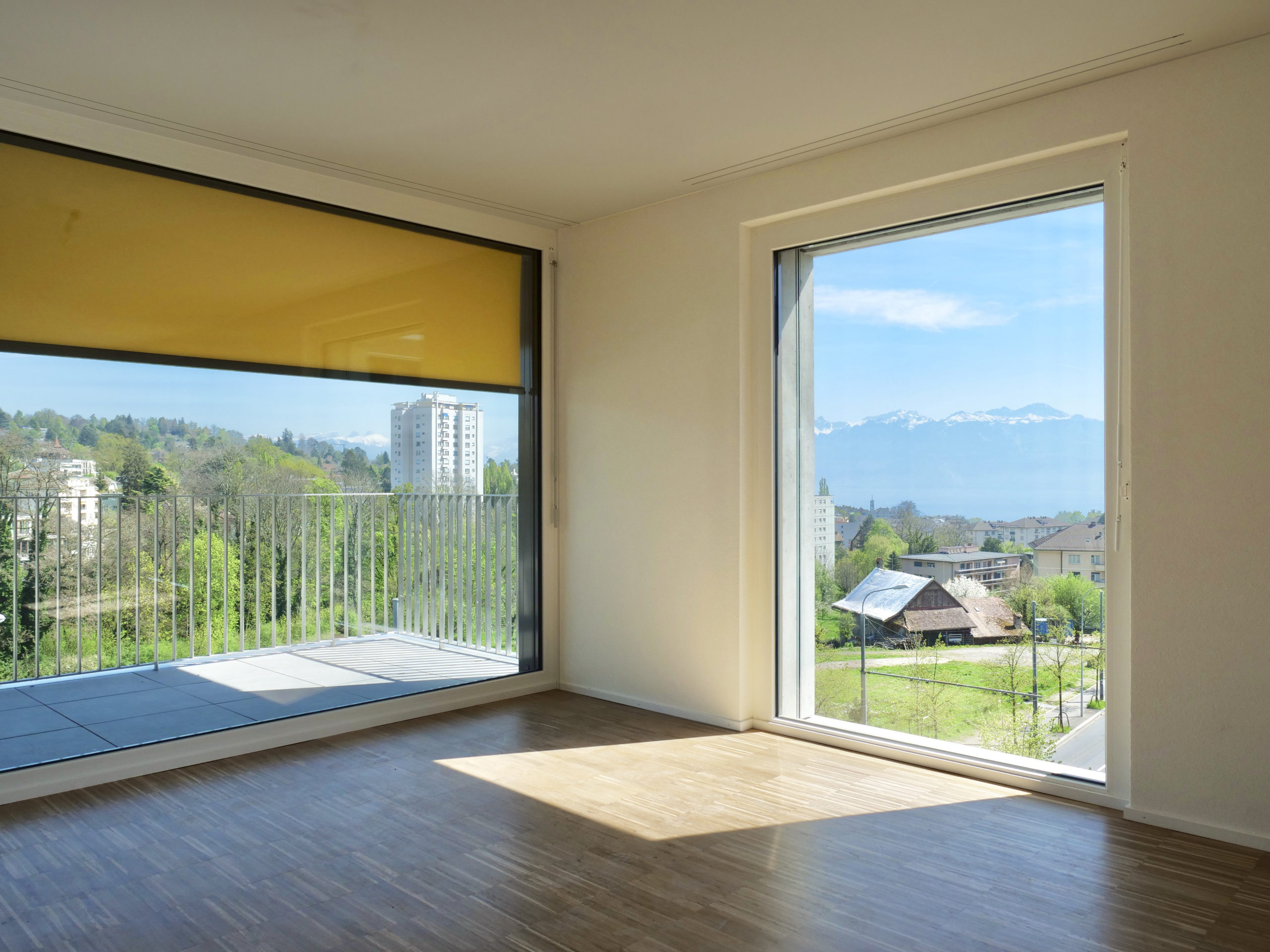 Cette typologie se répète jusqu’à l’attique, où l’on retrouve uniquement deux appartements de 3,5 pièces. Ceux-ci sont quasiment symétriques en plan du nord au sud et chacun bénéficie d’une grande terrasse panoramique avec vue sur le lac.
